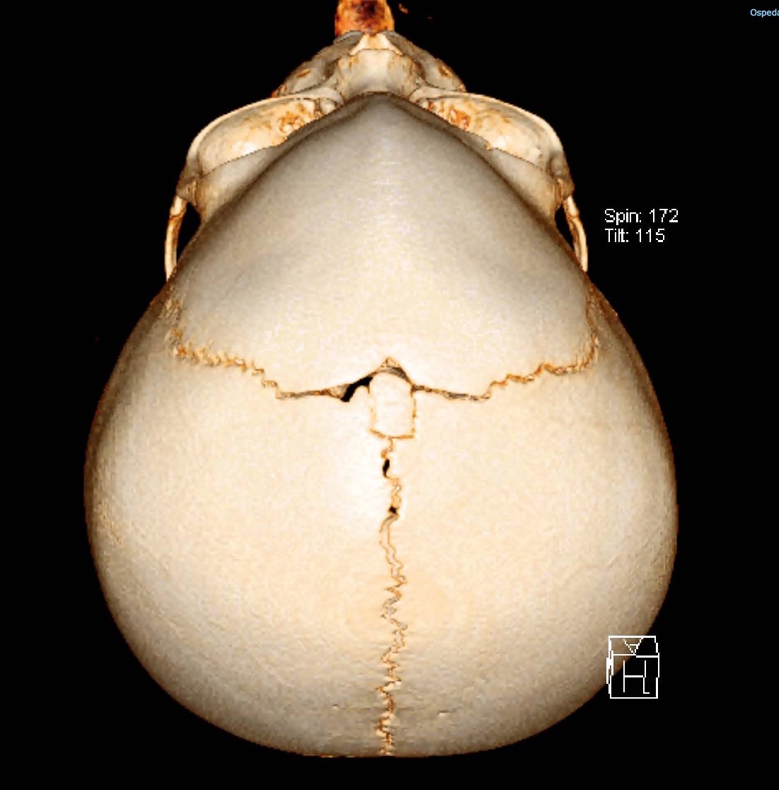 Causata dalla prematura chiusura di metà della sutura coronale, ha un’incidenza di una caso ogni 10.000 nati vivi, colpisce con la stessa incidenza maschi e femmine ed ha una trasmissione sporadica autosomica dominante. La deformità conseguente alla chiusura della sutura è caratterizzata dalla riduzione della dimensione antero-posteriore del cranio sul lato affetto, dalla posizione del padiglione auricolare del lato colpito più posteriore rispetto a quello dell’altro lato e dalla deviazione del naso verso il lato non affetto.